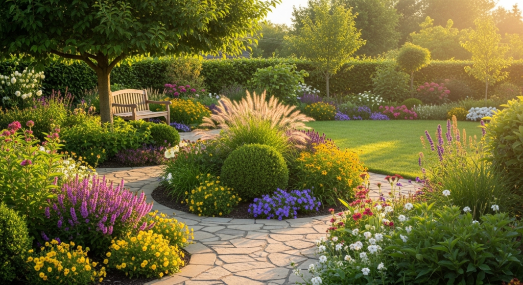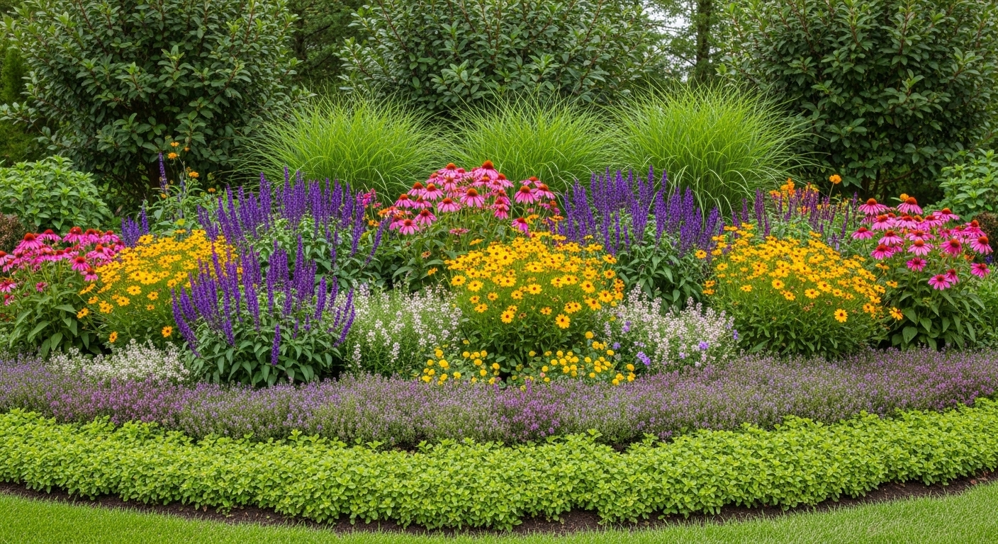 • Middle Row: Perennials in medium-size serve as main color sources.